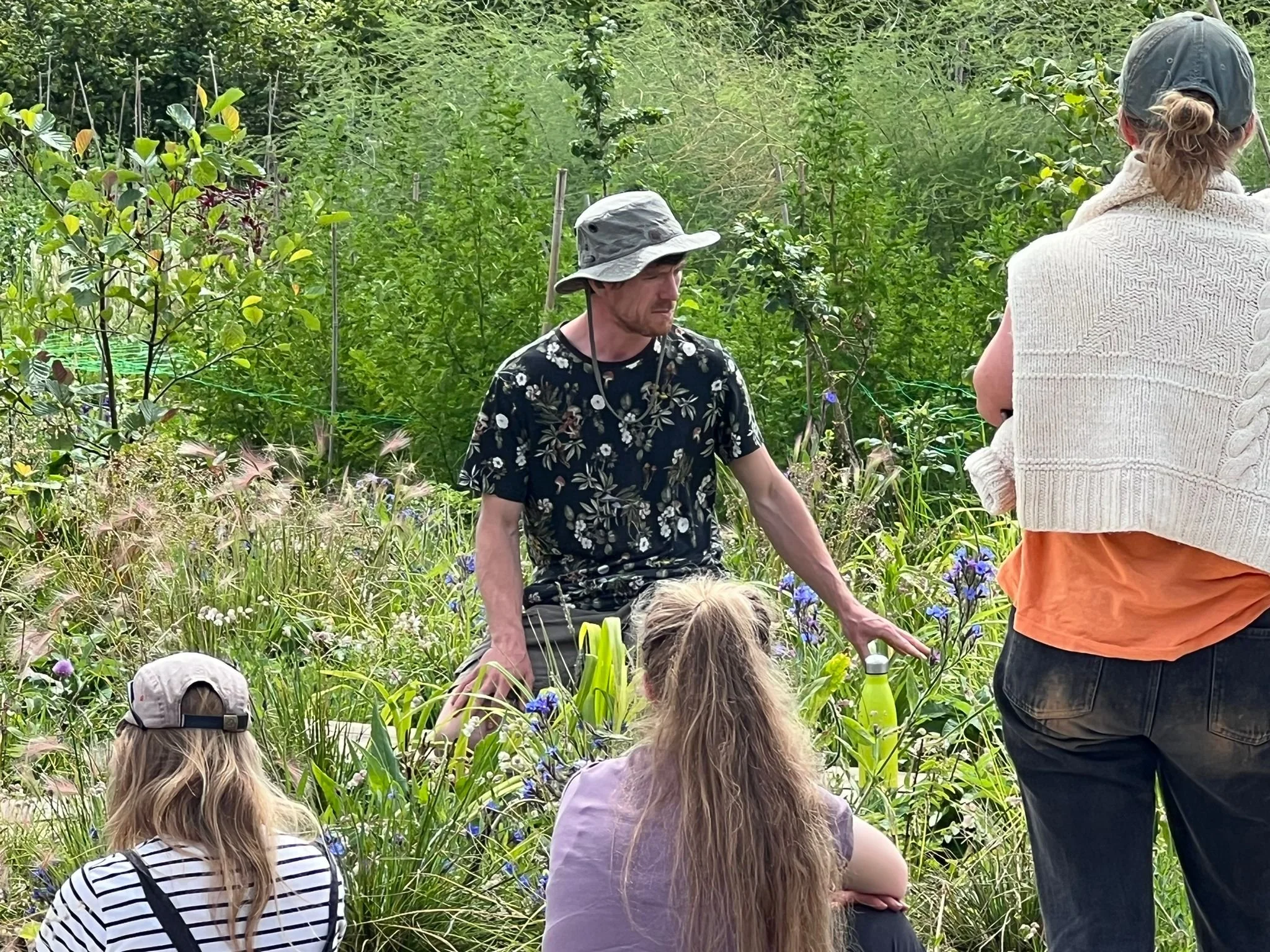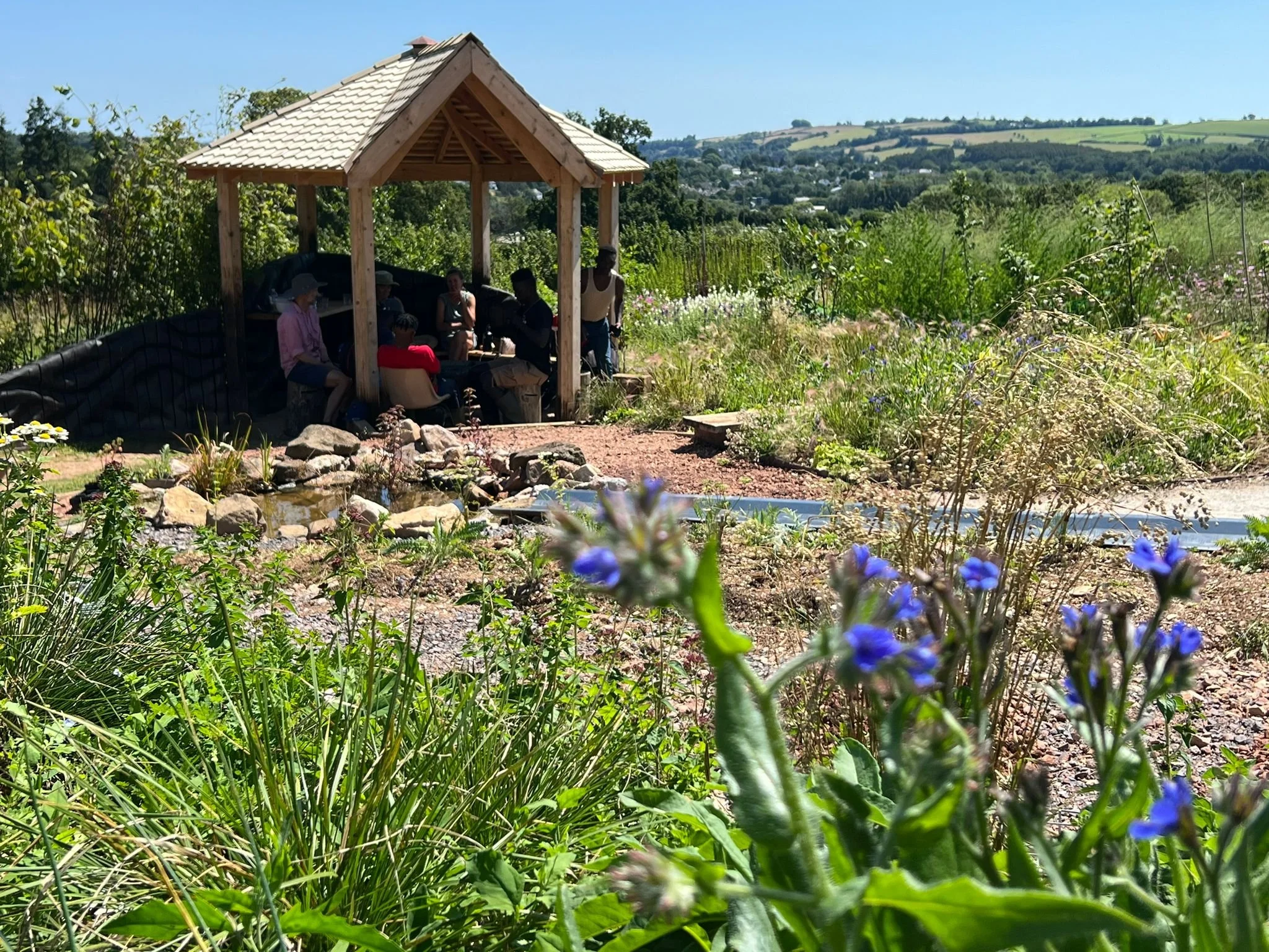 This garden has in great part been landscaped, planted and maintained together with enthusiastic volunteering asylum seekers from the DIG project coming both from Torbay, Totnes and Plymouth. Diversity in Gardens (DIG) operates in South Devon, addressing economic and social inequality by providing diverse communities with access to innovative land-based projects. A collaboration between Radical Ecology, The Apricot Centre, and Devon and Cornwall Refugee Support (DCRS), DIG emphasizes the importance of diversity for regenerating land, lives, and livelihoods, fostering cultural exchange, and connecting people with nature.